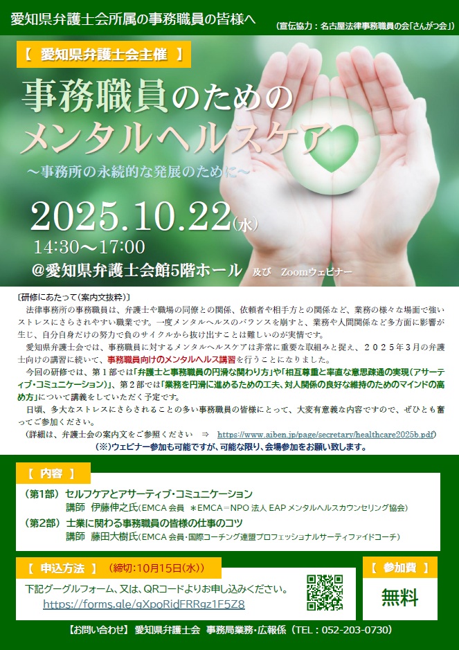 10月22日(水)に愛知県弁護士会主催で『事務職員のためのメンタルヘルスケア ~事務所の永続的な発展のために~』が開催されます。
