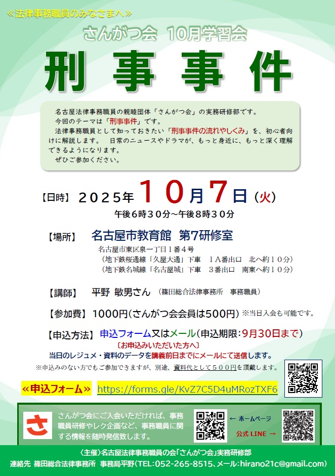 実務研修部より学習会のお知らせです。 今回は、『負債事件 連続学習企画』と題して1月・2月と負債事件をテーマに取り上げます。 その第2弾として、2月の学習会は「破産申立~個人破産~」について学習します。 個人破産の申立てについて、手続きの流れや、申立てに必要な書面の作成と必要書類など、申立全般の基礎を学ぶ講義です。 いずれも初心者向けの講義です。経験の浅い方にご理解頂けるよう、丁寧に解説します。各学習会はそれぞれ個別にご参加いただけますが、両方を受講していただくと、さらに理解が深まりますので、是非両講義ともご参加ください! 開催要項は,以下のとおりです。 ■ テーマ ■ 破産申立 ~個人破産~ ■ 日 時 ■ 2026年2月6日(金) 18時30分~20時30分(2時間程度) ■ 場 所 ■ 名古屋市教育館 4階 第9研修室 (会場アクセス) ■ 講 師 ■ 河合達希さん(弁護士法人名古屋法律事務所みなと事務所 事務職員) ■ 参加費 ■ 1000円(会員は500円)※当日徴収します。 《申込み方法》 以下申込みフォームからお申し込みください。 お申込みいただいた方へは、当日のレジュメ・資料のデータをメールにて送信します。 https://forms.gle/UNFGy8H4oULnADqb8 ※申込みがなくても参加は可能ですが、別途、資料代として500円を頂戴します。 さんがつ会学習会についてご不明な点がありましたら, 実務研修部長 平野 まで,お気軽にご連絡ください。 ⇒ hirano21c@gmail.com